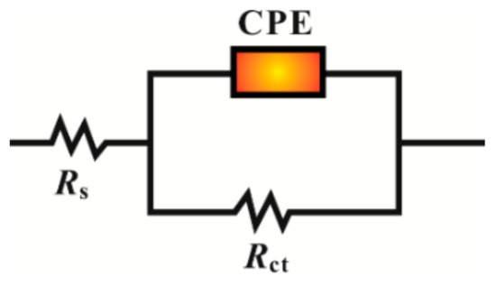 The equivalent circuit (Figure 3) is used to fit the impedance spectrum data, and the fitting data are shown in Table 1. In Figure 3, Rs is the solution resistance, Rct is the charge transfer resistance, and CPE is a constant phase element; the impedance of the CPE is expressed as follows [14,15]: