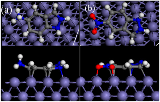 AIA-2H+ and NIA-H+ were placed in a simulation box parallel with or perpendicular to the Fe(110) surface. The simulation results showed that both AIA-2H+ and NIA-H+ tended to adsorb in parallel on the Fe(110) surface, as shown in Figure 7. Namely, the indazole and aromatic rings were the adsorption sites, which was in agreement with previous reports. Besides, all the hydrogen atoms upturning after adsorption may be due to the hybridization between Fe and heavy atoms. The AIA molecule is possibly a more efficient inhibitor because of its more negative adsorption energy (−4.65 eV) than NIA (−4.05 eV). This is consistent with the analysis of the electrochemical measurements.
