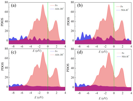 Density states projected of (a,c) AIA-2H+ and (b,d) NIA-H+ molecules before and after adsorbing on the Fe(110) surface.
