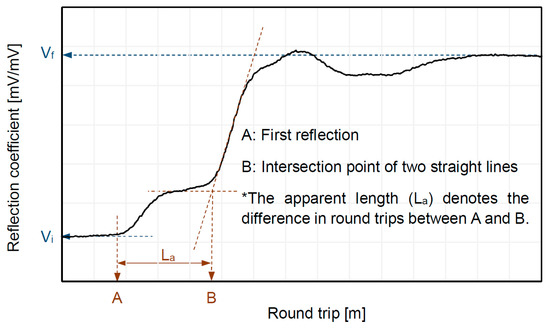 where L denotes the length of the TDR electrode, and Vi and Vf are reflection points at the beginning and end of the probe, respectively. εPM is the dielectric constant of the porous material, which can be calculated using the apparent length (La) and probe length (L) (εPM = La2/L2), as shown in Figure 1. Note that the electrical resistivity (ρPM) can be obtained with the reflected waveform from TDR, and that both the saturation factor (δ) and the cementation factor (β) can be estimated from ρPM.