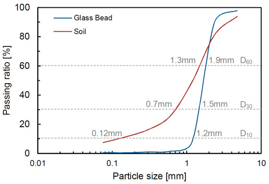 Glass beads and disturbed soil extracted in the field were selected as specimens. Sieve tests were performed, and the particle distribution curves are shown in Figure 2. Figure 2 shows that the glass beads and soil have uniform and well-graded grain size distributions. The diameters corresponding to 10%, 30% and 60% passing ratios are determined to be 1.2 mm, 1.5 mm and 1.9 mm for the glass beads, and 0.12 mm, 0.7 mm and 1.3 mm for the sand, respectively. The uniformity coefficients of the glass beads and soil are calculated as 1.6 and 10.8, respectively. Additionally, the coefficient of the curvature is determined to be 1.0 and 3.1 for the glass beads and soil, respectively. The material properties of the glass beads and soil are also summarized in Table 2.