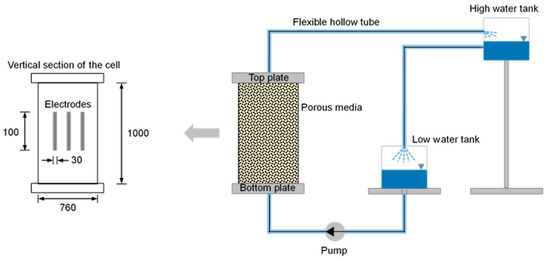 The cell, which is a cylinder, has an inner diameter of 760 mm and a height of 1000 mm. The three electrodes for generating the electromagnetic wave and for receiving the reflected waves were installed into the inner part of the cell, as shown in Figure 3. The inner part of the coaxial cable is connected with the inner single electrode, and the outer part of the coaxial cable is soldered with two left electrodes. The dimensions of the electrode are: 30 mm width, 100 mm height and 1 mm thickness. The TDR electrode was installed at a depth of 500 mm with respect to the center of the electrode. To transmit and measure the electromagnetic wave, the TDR instrument (HL1101, HYPERLABS, Beaverton, OR, USA), which can generate a voltage of 250 mV with a frequency of 10 MHz, was selected. The voltage propagated and reflected through parallel rod electrodes connected with a coaxial cable of 50 Ω. It measures the dielectric constant, which can be converted into electrical resistivity and saturation through Equations (4) and (5), respectively. The fluid is injected from the bottom plate with a pump, and the fluid flows out from the top plate. To improve the electromagnetic wave propagation ability, 0.5 M of a salty solution was used as the fluid. The reflected waveforms were measured every 2 min for 10 min because the measured waveforms were all the same after 10 min. Therefore, the 1st, 2nd, 3rd, 4th, 5th and 6th steps correspond to ≈0, 2, 4, 6, 8 and 10 min, respectively. One can observe that after 10 min the porous media is fully saturated.