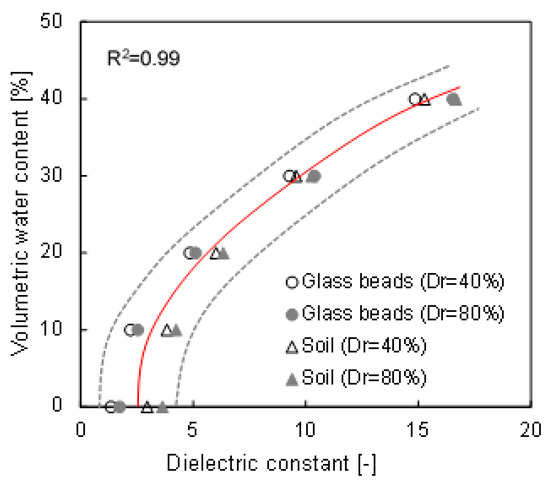 Note that the calibration was performed up to a 40% volumetric water content, because it was difficult to prepare the specimen when the volumetric water content was over 40%.