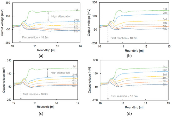 Measured waveforms from TDR: (a) glass beads (Dr = 40%); (b) glass beads (Dr = 80%); (c) soil (Dr = 40%); and (d) soil (Dr = 80%). The Dr denotes the relative density, and the dotted points show the reflected positions from the medium.