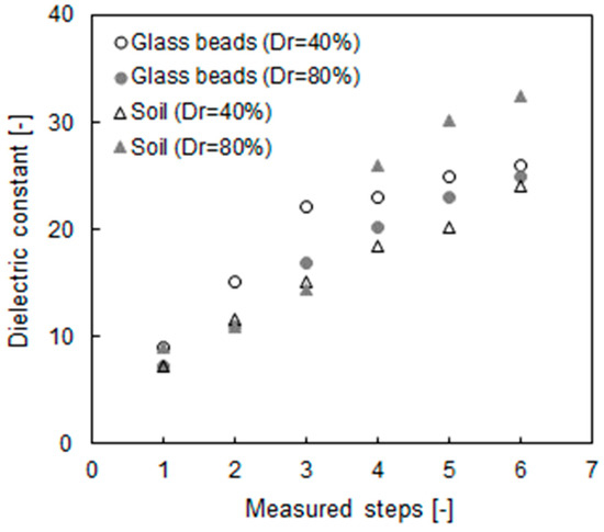 The measured waveforms for the glass beads and soil are shown in Figure 5. The first reaction of all of the waveforms occurred at similar positions, approximately at 10.3 m, because the characterization of the TDR probe and the length of the specimen connected on the probe were the same. However, the second reflection points, which are shown as dots in Figure 5, vary according to the specimen type and relative density. The round trips of the dotted points gradually increase with time (saturation) due to the attenuation of the electromagnetic wave from ions in the fluid. In particular, the waveforms measured at the 1st and 2nd steps at a relative density of 40% exhibit a higher attenuation than those measured at a high relative density because the low relative density has a high potential to absorb water with high porosity [38].