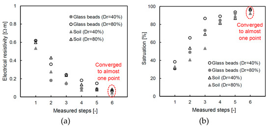 The changes in the electrical resistivity and saturation calculated in Equations (4) and (5) are plotted in Figure 7; one can see that the electrical resistivity decreased from 0.55 Ω⋅m to 0.055 Ω⋅m, on average, with each step. We consider that the high electrical resistivity appeared due to the content of air in the unsaturated condition. The electrical resistivity of the final stage converges on almost a single value because the electrical resistivity of the fluid dominates the total electrical characterization of the medium as the specimen approaches a 100% saturation [23]. Note that the concentration of the solution is 0.5 M of the salty solution. The saturations of the specimen are estimated to be in the range of 33% to 38% at the initial step, before the values increased to 98% in the final step. The glass bead with a relative density of 40% shows a higher saturated value than that with a relative density of 80% at every step. The result demonstrates that, as the relative density is affected by the saturation speed, the tortuosity, which is the path of the water flow, decreases with an increasing relative density [41]. However, small dielectric constants were observed with the soil that had a relative density of 40% at the 4th, 5th, 6th and 7th steps. The reason for the different behavior is attributed to the content of fine particles, and Ponizovsky et al. [42] showed that it is difficult to determine the calibration constant of TDR when the fine contents increased. In the near future, a study needs to analyze the TDR waveform according to the amount of fine particles. Although the individual behavior is slightly different, in Figure 6 one can see that the overall behavior is consistent. Every saturation at the final step also exhibits similar values and indicates that the circulation time is adequate for achieving a fully saturated condition for every specimen.
