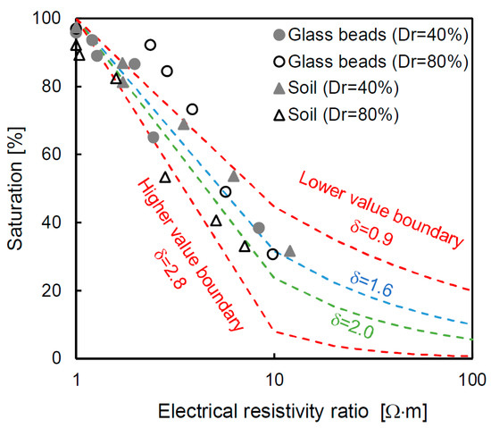 Electrical resistivity ratio versus saturation. The electrical resistivity ratio denotes the relationship between the electrical resistivity of the specimen and the electrical resistivity of the same specimen under the 100% saturated condition. The saturation factors (δ) of 1.6 [43] and 2.0 [35]. The values of the upper and lower boundaries are based on the measured data in this study.