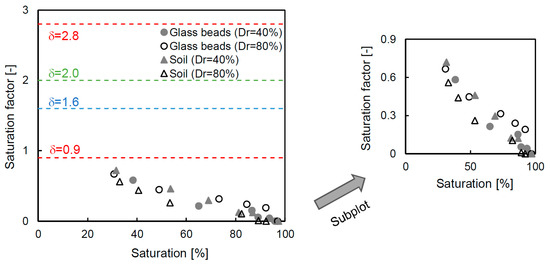 The relationship between the saturation and the electrical resistivity ratio is related to the saturation factor, as shown in Equation (3); the values, which are derived from the measured values, are presented on a semi-log scale in Figure 8. The relationship is highly variable, and thus the values are relative to the upper (δ = 2.8) and lower (δ = 0.9) boundaries from the trend line of the measured values. The saturation factors from previous studies of 1.6 [43] and 2.0 [35] are also plotted in this figure, and these values are within the range proposed in this study. The saturation factor exhibits a nonlinear behavior, and there are two different slopes according to the electrical resistivity ratio. Therefore, there is a limit to uniformly using the values derived from one sample in the entire range. Even though [44] suggested an additional constant factor, which they obtained through linear regression results, the method has a limited reliability depending on the degree of saturation of each sample because the method also uses the entire trend line. Thus, the saturation factor is calculated at every stage, considering the specific saturation and electrical resistivity ratio. The detailed saturation factor, which is calculated by inverting Equation (3), is shown in Figure 9. The saturation factor is different for each degree of saturation because the electrical resistivity ratio varies, and therefore deriving a saturation factor using the entire trend of the data includes an error. For the glass beads and soil, the newly calculated saturation factor is in the range of 0.67–0.72 at the initial step, and the value gradually decreases to ≈0 at the fully saturated condition of every specimen. The reason why the saturation factor is almost 0 is because the electrical resistivity ratio is at unity at the 100% saturated condition. The saturation factor in Figure 9 is different from the value derived from the trend line based on δ = 0.9, 1.6, 2.0 and 2.8 (in Figure 8). This tendency suggests that an appropriate saturation factor for each saturation should be determined rather than applying a single value that simply reflects the trend line.