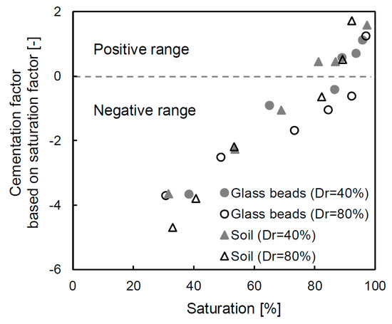 Note that Equation (6) shows that the cementation factor can be predicted when the saturation of the porous material is changed. The calculated cementation factor is shown in Figure 10 and the range of values includes both negative and positive numbers. The detailed cementation factor alternation is also summarized in Table 3. At the initial saturation (≈30–39%), the cementation factor is −3.93 on average, but this changes to a positive value at approximately 90–100% saturation. Even though the degree of saturation exceeds 90%, the cementation factors of glass beads with a 40% and 80% relative density still have negative values. Note that the degree of saturation is a crucial parameter to obtain an accurate cementation factor, and thus the specimen should not assume a fully saturated condition even though it contains water. In particular, the cementation factors of the final saturated condition are 1.12, 1.25, 1.58 and 1.71 for the glass beads of 40% relative density, the glass beads of 80% relative density, the soil of 40% relative density and the soil of 80% relative density, respectively. The estimated cementation factors are similar to those proposed in previous studies [28,34].
