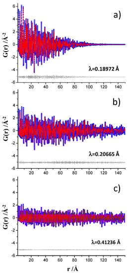 The PDF experimental data were obtained using PDFgetX3 [33] with Qmax = 24 Å−1 for the three experimental configurations studied. Moreover, for ID15A and ID22 datasets, the PDF profiles were also obtained using Qmax of 29 and 26 Å−1, respectively. Structural information and quantitative phase analysis results were obtained from the PDF data by using the PDFGui software [34]. For the nickel-standard the following parameters were optimized/determined: scale factor, unit cell parameter, delta2 parameter (low-r correlated motion peak sharpening factor) [35,36], the instrumental parameters Qdamp and Qbroad, and ADPs (Atomic Displacement Parameters).