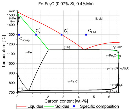 Glinkov et al. presented a slightly different aspect in [14]. In their theoretical exploration, they determined that the interface composition was equal in the solid and the liquid (). It was not clearly defined if the interface carbon concentration in Glinkov’s research work was either or .