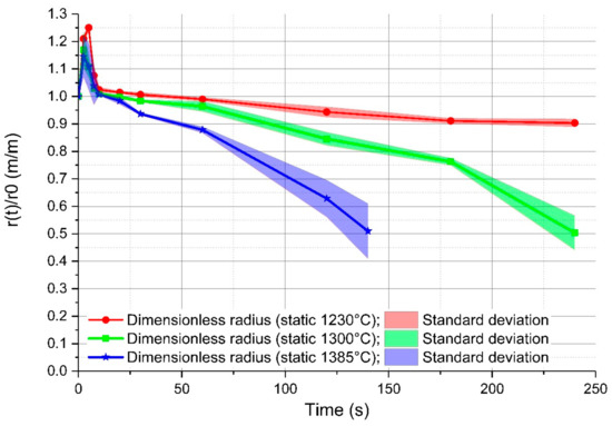 As mentioned above, the authors investigated in [20] the dissolution and melting behaviours of the scrap. For each specified immersion time, three samples were submerged into fresh, hot metal. The average rate of the radius after immersion (r(t)) with the initial radius (r0) was further determined through the weight. The detailed description of the experiments and the evaluation of the ablation rate and mass transfer coefficients can be taken from [20]. In Figure 3, the average rate of the radius after the specified immersion time with the initial radius is shown for a stagnant system. In the initial 10 s, shell freezing occurred, which reached its maximum point after approximately 5 s. The maximum radius of the frozen shell was temperature-dependent and was in the range of 15% at an initial temperature of 1450 °C to 25% at 1305 °C of the initial scrap radius. After melting of the shell, a constant dissolution of the mother scrap occurred, which was faster with increasing temperature. The light areas in Figure 3 show the standard deviation of the determined radii. The results of the average dissolution rate of the radius after immersion (r(t)) with the initial radius (r0) are published in [20].