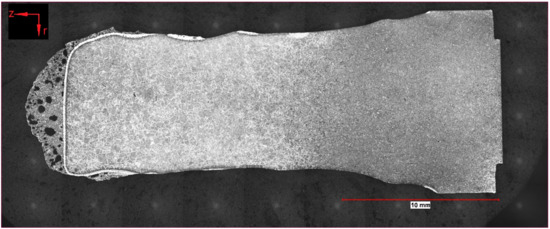 To summarize the observations of optical microscopy, a few samples were taken for this publication. Two of the samples (162 and 107) presented in detail were submerged—without rotation of the sample—into the hot metal to receive stagnant conditions influenced only by natural convection. The Nital-etched longitudinal area of samples 162 and 107, which were submerged for 20 s at an initial temperature of 1305 °C and 180 s at 1370 °C, respectively, were visible in the mosaic picture in Figure 4 and Figure 5. Through the energy balance, the equilibrium temperature between scrap core and hot metal dropped to 1230 or 1300 °C, respectively. Sample number 59 was submerged into the hot metal for 60 s at an initial temperature of 1450 °C and a rotational speed of 100 rpm. Owing to this speed, turbulent conditions occurred in the hot metal. The Nital-etched longitudinal area of sample number 59 is shown in Figure 6.