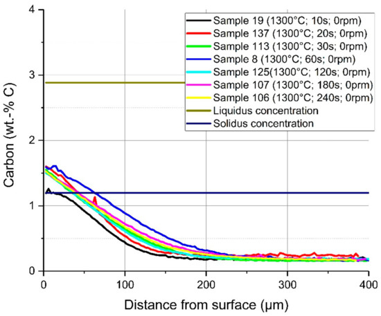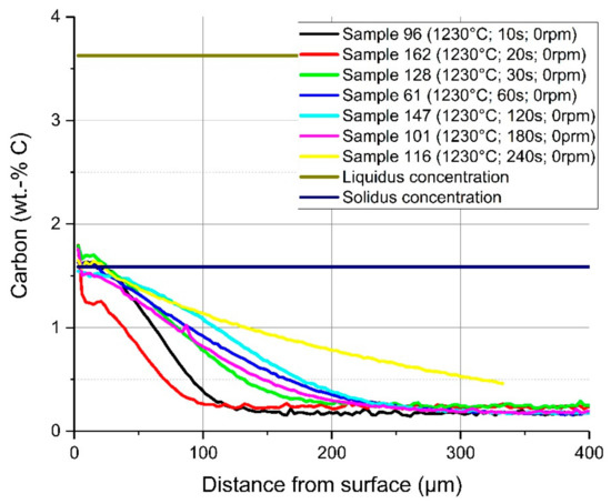 In Figure 11, a comparison of the average carbon diffusion profiles of samples with different immersion times at an equilibrium temperature of 1230 °C and natural convection conditions in the bath is shown. The detected lines were cut at the detected interface between the solid and liquid melt. It can be seen that the diffusion profile was nearly equal, and the diffusion depth was approximately 200 µm, except at the two shortest immersion times of 10 and 20 s where the profile was not well developed. At an immersion time of 240 s, carbon diffusion was much deeper, which was a result from the measuring position being too close to the ground surface of the sample. The same behaviour and approximately the same diffusion depth of the carbon were detected for samples with a rotation speed of 100 rpm so that turbulent conditions existed in the melt. The comparison of the average carbon compositions from starting at the liquid–solid interface for turbulent bath conditions is shown in Figure 12. The received interface carbon content in the solid was equal to the solidus carbon content at this temperature.