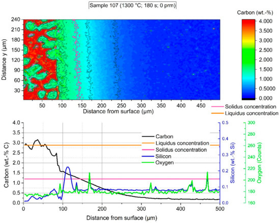 The colored shape image in Figure 10 shows the carbon distribution of sample 162. The red area on the left side shows the frozen residual melt with a carbon composition of more than 4 wt.-%, including liberated grains from the scrap with a composition below the solidus composition. To compare with the microstructure picture in Figure 7, the red area stopped at the brown sharp interface. From the average carbon composition in the graph, it can be seen that carbon from the hot metal diffused approximately 100 µm into the scrap. A steep gradient from the solidus point at the interface to higher carbon contents in the former melt region was visible. Due to distortions of the liberated grains, it is not clearly readable from the average graph that the carbon composition on the liquid side of the interface steps from the interface carbon composition directly to the hot metal carbon composition. It could be seen that the average silicon formed a layer on the scrap side surface with silicon contents four times higher than in the scrap and one and a half times higher than in the hot metal. Inside the scrap, it was visible that the small silicon peaks were congruent with the oxygen counts, which was a sign of silicon oxide inclusions.