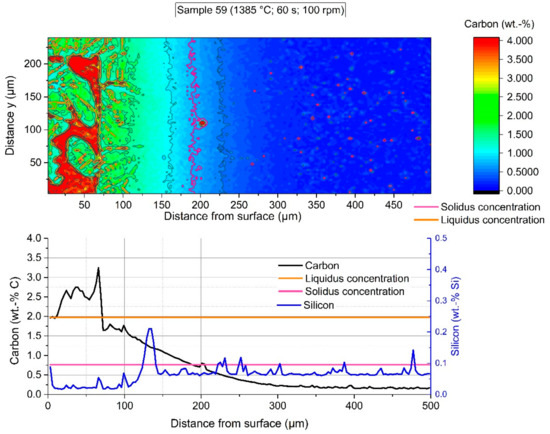 The colored shape image in Figure 16 shows the carbon distribution of sample 59, which was immersed for 60 s in hot metal with turbulent bath conditions realized through a rotational speed of the sample of 100 rpm. The adjusted equilibrium temperature between scrap core and hot metal reached 1385 °C. Again, there was a steep gradient between the carbon concentration at the interface () up to the hot metal carbon concentration of more than 4 wt.-% carbon. The average carbon concentration in the graph below was influenced by liberated grains. In comparison to the microstructure in Figure 9, it was observable that the solidus concentration was deep inside the scrap, and the dissolution was again inhibited. A further point to mention is that there was no possibility to clearly define in which state (e.g., graphite or as a component) the dissolved carbon existed in the boundary layer region. As at lower temperatures the contour levels of the interface carbon composition in the solid, the carbon concentration of the liquidus line, and the carbon concentration of the hot metal were identical.