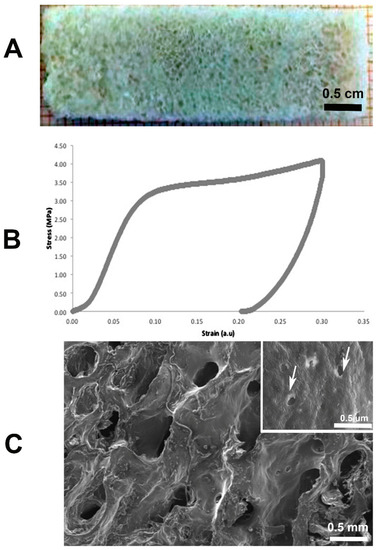 Representative: (A) Demineralized scaffold; (B) stress-strain curve of demineralized bone; (C) SEM observation with bony trabecular network and empty osteocytic lacunae (arrows).