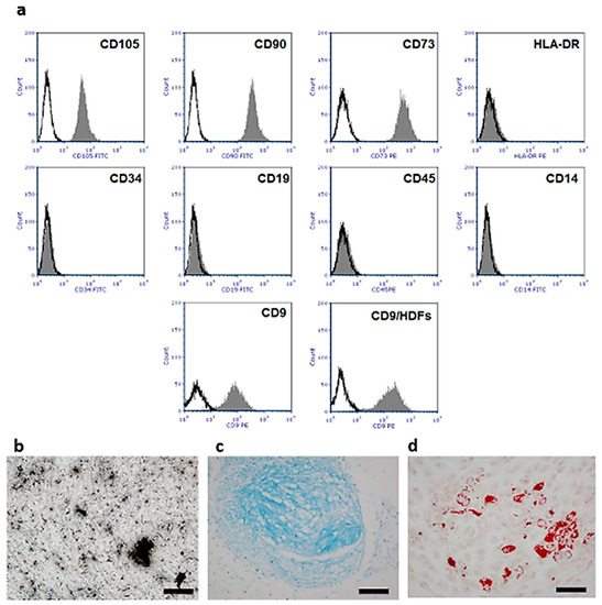 Evaluation of hUC-SC surface markers were made by flow cytometry at the 3rd cell passage of subculture. Cells expressed CD73, CD90, and CD105 antigens and were negative for CD34, CD45, HLA-DR and CD14. According to the minimal criteria recommended by the International Society for Cellular Therapy [27], our cells could be considered to be MSCs. Besides, our cell population displayed a lower expression level of CD9 with respect to Human Dermal Fibroblasts (HDFs), with a Mean Fluorescence Intensity (MFI) of 94.18 in hUC-SCs and 167.76 in HDFs. This data confirms that the analyzed cell populations were homogenous with no fibroblast contamination [28] (Figure 2a). In vitro differentiation assays demonstrated the ability of hUC-SCs to differentiate, in appropriate culture conditions, into chondrocytes, osteoblasts, and adipocytes (Figure 2b–d), strengthening their belonging to the MSCs family.