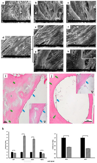SEM micrographs of scaffolds cultured with hUC-SCs for 7 (a–c) and 14 (d–h) days at different magnifications. Cells were able to adhere and colonize the scaffolds. Note the presence of membrane blebs after 14 days of culture suggestive of active metabolizers. Light microscopy (LM) micrographs of cells on demineralized scaffold at 7 (i) and 14 (j) days of culture: H = Haversian canal; green arrows indicate osteocytic lacunae; blue arrows indicate hUC-SCs; (k) histograms depict changes in Alkaline Phosphatase (ALP), Collagen Type 1 (COL1), ostenectin (ON; also known as secreted protein acidic and rich in cysteine (SPARC)), osteocalcin (OC; also known as bone gamma-carboxyglutamic acid-containing protein (BGLAP), sex-determining region Y (SRY)-Box2 (Sox2), and octamer-binding transcription factor 4 (Oct4) mRNA expression in hUC-SCs. Data are expressed as fold-change (2−ΔΔCt) of the expression at 14 days culture over 7 days one: square brackets indicate significant differences (p < 0.05).