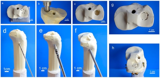 Fracture simulation, reduction, and additional screw osteosynthesis. Workflow of specimen preparation for the fracture model: Five determined breaking points (a) for the indenter (b) were set on the lateral tibial plateau to produce a pure impression fracture (c). After placing a K-wire under the depressed fragment (d), the lateral corticalis was opened with a drill (e), enabling placement of a cannulated ram (f) to compact subchondral spongiosa and restore a plane joint surface (g). In groups 5–7, fracture stabilization was complemented with a four-screw osteosynthesis using the jail technique (h).