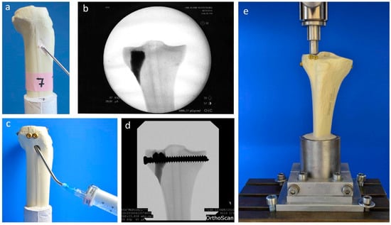 Application of bone cement and test set-up. Visualization of the different test groups: In groups 1–4, the remaining metaphyseal bone defect after fracture reduction was filled up with bone substitute only (a). In contrast, in groups 5–7, an additional screw osteosynthesis was set by the jail technique (c) and the filling of the defect was done before or after the osteosynthesis, depending on the drillability of the cement. To control the complete filling with cement and the position of the screws, specimens were examined by X-ray (b,d) before the biomechanical testing, where an axial load on the fixed fracture was performed (e).