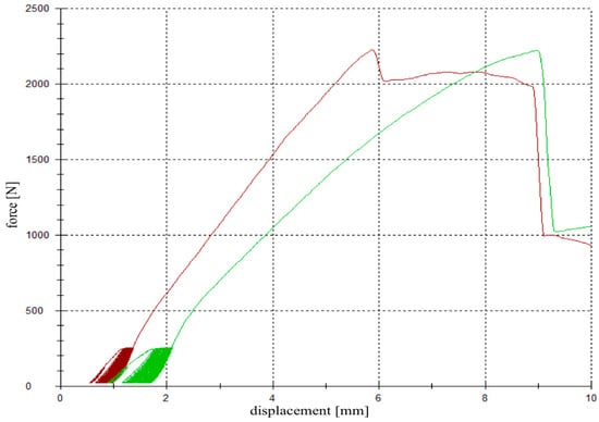 Load-displacement curve. A cyclic loading phase with 10 settling and 3000 measuring cycles was followed by a load-to-failure test. The red graph demonstrates the load-displacement curve of a specimen filled up with magnesium phosphate cement (MPC) (group 2), whereas the green graph corresponds to a specimen filled up with calcium phosphate cement (CPC) (group 3).
