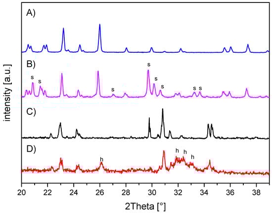 X-ray diffraction patterns of the in-house-prepared cements before and after setting at 37 °C for 24 h. (A) Magnesium phosphate cement raw powder; all peaks correspond to farringtonite Mg3(PO4)2 (PDF-No. 33-0876). (B) Magnesium phosphate cement after setting with additional struvite (s) phase (PDF-No. 03-0240). (C) α-tricalcium phosphate cement raw powder; all peaks correspond to α-TCP (PDF-No. 09-0348). (D) Dual setting α-TCP/HEMA cement after setting with additional hydroxyapatite (h) phase (PDF-No. 09-0432).