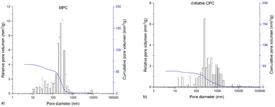 X-ray diffraction patterns of the in-house-prepared cement raw powders and the set cements were recorded with a Siemens D5005 diffractometer (Siemens, Karlsruhe, Germany) in a 2θ range from 20°–40° with a step size of 0.01°. The qualitative phase composition was evaluated by comparing the diffraction patterns with reference patterns from the PDF-database. Mercury porosity analysis (PASCAL 140/440, Porotec GmbH, Hofheim, Germany) was applied to compare relative and cumulative pore volume, average and median pore diameter, and visualize pore size distribution. Therefore 250–350 mg of each sample was placed in a dilatometer and filled with mercury. At an applied pressure of up to 400 MPa, the pore size distribution in the range of macropores and mesopores (0.01–10 μm) was determined. For evaluation, the software “solid” was used.