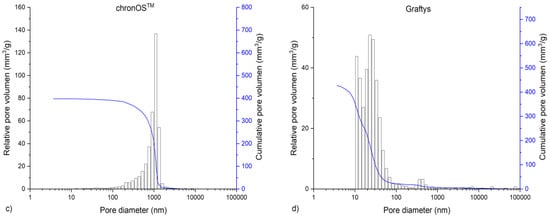 Graphs of mercury porosity analysis. Displayed are the graphs of the mercury porosity analysis for each bone substitute used in the study, (a) Magnesium phosphate cement; (b) Dual setting α-TCP/HEMA cement; (c) ChronOSTM Inject; (d) Graftys® Quickset. Relative pore volume (mm3/g) as well as cumulative pore volume (mm3/g) as a function of pore diameter are shown. Lowest cumulative porosity for in-house formulations and largest pores in ChronOSTM were determined: An equivalent low cumulative pore volume was found for the drillable CPC and MPC, whereas the commercial formulations showed distinctly higher cumulative pore volumes. The highest average pore volume and median pore volume were determined for ChronOSTM Inject.