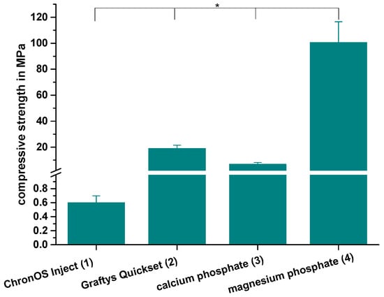 The compressive strength after 24 h of setting in water at 37 °C is revealed by Figure 7. With a value of 0.6 ± 0.1 MPa, the lowest compressive strength was observed by commercially available brushite-forming cement (ChronOSTM Inject), while the struvite-forming in-house-prepared MPC actually showed a compressive strength of approximately 100 MPa. Though both residual groups form calcium-deficient hydroxyapatite as the main mineral setting product with a compressive strength of 19.0 ± 2.5 MPa, the commercial version (Graftys® Quickset) was almost three times as strong compared to the in-house-developed formulation. All differences between the single groups were significant, with p < 0.01.