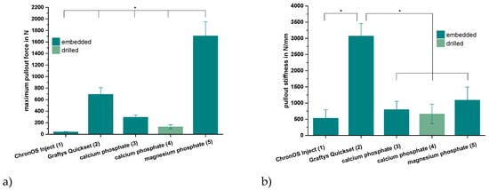 Only the in-house-prepared dual setting CPC sustained tapping and drilling after a short pre-setting time of 10 min due to its pseudoplastic fracture behavior, as previously shown for cements with similar compositions [12]. Thus, for the other cement groups, the cortical screws were solely embedded in the cement matrix prior to setting. As shown by Figure 8a, the maximum pullout forces each exhibited similar tendencies as already proved within the compression test setup for the pure cement specimens (Figure 7). Mean maximum pullout forces lay between 41 ± 7 (ChronOSTM Inject) and 1704 ± 248 N (magnesium phosphate), while all differences between the single groups were significant (p < 0.01). When choosing embedment instead of manual drilling in the case of the dual setting CPC, a 2.3-fold increase of the maximum pullout force from 129 ± 38 to 295 ± 39 N occurred (Figure 8a).