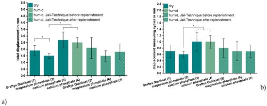 ChronOSTM Inject, the commercially available brushite-forming cement formulation, exhibited compressive strength and screw pullout force, which were at least one order of magnitude lower than the residual formulations. Thus, it was not examined further by the elaborate dynamic tests in the tibial head depression fracture model, of which Figure 9 depicts the results. Obviously, the lowest overall displacement of ~1.5 mm occurred for augmenting the depression fracture model with MPC, both with cement only as well as applying the jail technique, but only in the case of pure augmentation was the difference toward other cements significant, at p < 0.01. In general, both storage conditions (dry and humid) and the combination with screw osteosynthesis did not seem to have an impact on the displacement; however, a slight decrease of approximately 0.7 mm from 2.5 ± 0.4 to 1.8 ± 0.6 mm was observed in the case of the dual setting calcium phosphate with the jail technique in contrast to without it (Figure 9a). The tendencies, when only considering the measuring cycles without the settling cycles (Figure 9b), were quite similar, though the displacement caused by the measuring cycles only made up less than the half of the total displacement. Again, the in-house-prepared magnesium phosphate exhibited the lowest displacement of 0.6 ± 0.1 mm without osteosynthesis, but the difference between magnesium phosphate and Graftys® Quickset did not reach statistical significance beyond this and the difference toward other formulations was equally marginal when applying the jail technique (Figure 9b).