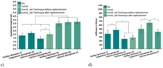 As seen in Figure 9c, the additional osteosynthesis improved the mechanical outcome significantly of the treated tibial depression fractures for every type of bone substitute, such that the maximum load before failure increased for example from >1.4 kN (calcium phosphate only) to up to 3.75 ± 0.31 kN (calcium phosphate with the jail technique). Under humid storage conditions, calcium phosphate exhibited a significantly higher maximum load compared to the samples stored under dry conditions with p < 0.01.