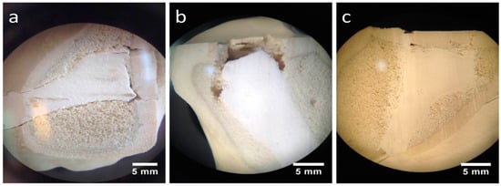 Stereomicroscopic images. Better interdigitation of the humid CPC and seamless interdigitation of the MPC: Regarding augmented tibial head depression fractures under a stereomicroscope, a low interdigitation with a visible gap to the spongiosa could be seen for the CPC when stored under dry conditions (a). In contrast, under humid storage conditions, the interdigitation for the same cement seemed to improve remarkably, showing no gap (b). A full interdigitation to the nearby spongiosa up to the reduced fracture fragment was detected for the MPC (c).