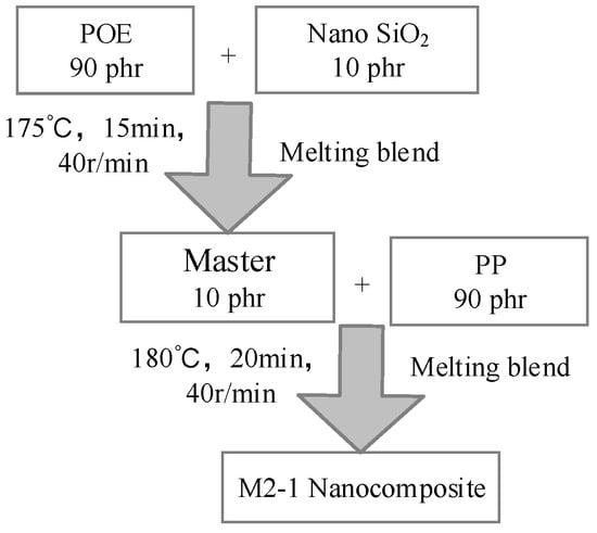 The matrix was isotactic PP (HC314BF, Borealis, Abu Dhabi, United Arab Emirates), and the POE (POE-0201, Exxon Mobil Corporation, Shanghai, China) was ethylene-octene copolymer particles with 20% to 30% octene content. The average diameter of nano-SiO2 was 30 nm and it was modified by silica agent. The composites compounded of PP and nano-SiO2 were melted using internal mixer (HAAKE Polylab QC, torque rheometer, Waltham, MA USA) at 180 °C, counter-rotating at the speed of 40 rpm for 20 min. The composites compounded of PP, POE, and nano-SiO2 were prepared by a two-step method. In the two-step method, the nano-SiO2 and POE were first melted at 175 °C and 40 rpm for 15 min to prepare the master batch, and then the PP was blended with the master batch at 180 °C and 40 rpm for 20 min to prepare the composite of M2-1. The details of the two-step method is shown in Figure 1.