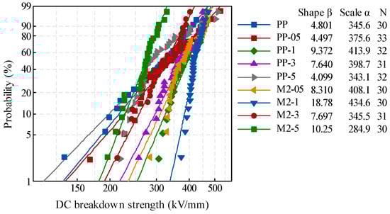 The breakdown strength was an important parameter to evaluate the insulation reliability of the material. In this study, the DC breakdown strength of composites with different content of filler was measured to pre-select firstly. The failure of dielectric followed a certain probability, and the Weibull distribution was usually used to analyze the breakdown data [18,19]. The scale parameter α, which is known as the characteristic breakdown strength (kV/mm), is the strength at which the breakdown probability is 63.2%. The shape parameter β represented the dispersion of breakdown data. The Weibull distribution of breakdown strength results were shown in Figure 2.