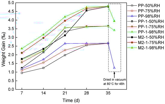 Hygroscopic ratio change of PP, PP-1, and M2-1 degraded at 50%, 75%, and 98% RH for 35 days, and after dried in vacuum at 80 °C for 48 h.