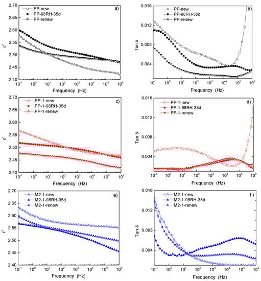 Figure 5b,d,f showed the frequency-depended loss of PP, PP-1, and M2-1, respectively, at different degradation stages. The hygroscopicity reduced the loss at frequency less than 10 Hz in the three sample groups, because water molecules hindered the directional movement of carriers under the test field strength. The obvious relaxation loss peaks appeared in the degraded samples at frequency range from 104 Hz to 105 Hz, indicating that the water molecules in the samples formed polar groups and relaxation polarization loss under alternating electric field. After vacuum drying, the relaxation loss peak caused by hygroscopicity in PP disappeared, while that in nanocomposites persisted. This showed that water molecules were distributed freely in PP matrix while bounded in nanocomposites [22]. Vacuum drying could only remove part of free water molecules, but it was difficult to remove bound water molecules. As the polarization and conduction processes were only related to the structure itself in new samples, the permittivity was correlated with a loss in the new PP and its nanocomposites. After damp aging, the water molecules dispersed and interacted with samples, which affected the conductivity and relaxation process. Therefore, the dependence of permittivity and loss with frequency became complex in damp samples.