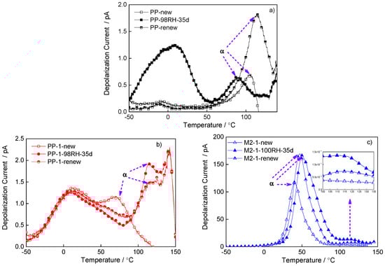 The depolarization current of new, degraded, and recovered samples. (a) Depolarization current PP; (b) depolarization current PP-1; and (c) depolarization current of M2-1.