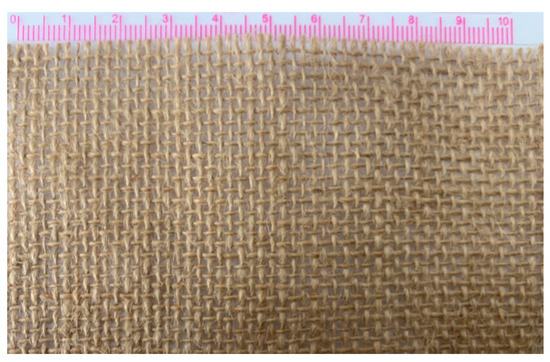 Epoxy resin E-44, polyamide resin 650, and thinner 692 were purchased from Zhenjiang Danbao Resin Limited (China) as the matrix of the composite. The plain jute fabrics supplied by Guangzhou Yin Fan Textile Limited (China) were used as continuous reinforcements. As shown in Figure 1, the jute fabric has the same warp and weft densities of 50/10 cm. 50 is the number of yarns per 10 cm in the warp and weft directions of jute fabric.