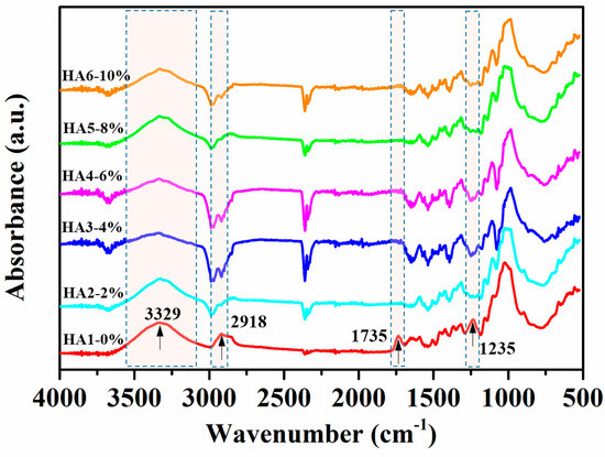 The variances in chemical structures and compositions between raw and hot-alkali-treated (five incremental concentrations) jute fibers were qualitatively analyzed, and their different groups’ vibrations are shown in Figure 4. The peak at 3329 cm−1 is an O–H stretching vibration of both treated and untreated jute fibers [28]. The hydroxyl groups are present in the main components of the jute fiber (cellulose, hemicellulose, and lignin), and bond together in the form of intermolecular hydrogen bonds or intramolecular hydrogen bonds. The peak at 2918 cm−1 is a C–H stretching vibration of cellulose and hemicellulose [29], which becomes weaker after alkali treatment. It is clear that the treated jute fibers (HA2, HA3, HA4, HA5 and HA6) with hot-alkali have no obvious absorption peaks at 1735 cm−1 and 1235 cm−1. The reason is that absorption peak at 1735 cm−1 is the C=O stretching vibration of the carboxylic acid in hemicellulose of untreated jute fibers [28,30]. In addition, the band at 1235 cm−1 appears to be due to the C–O stretching vibration of the acetyl group in the lignin of untreated jute fibers. However most of the lignin and hemicellulose of these jute fibers were removed by hot-alkali treatment. The chemical comparison of raw and treated jute fabrics are shown in Table 1. The cellulose content of 6% NaOH-treated jute fabric improved from 53.69% to 75.52%. The content of hemicellulose and lignin decreased from 25.56% and 11.10% to 10.43% and 9.05%, respectively. And the hot-alkali treatment not only changed the chemical comparison of the jute fabric, but also increased the crystallinity, accompanied by the removal of hemicellulose and lignin.