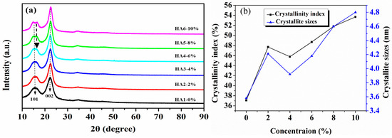 The X-ray diffraction patterns of jute fibers treated by five alkali concentrations at 120 °C are shown in Figure 5a. It exhibits that the diffraction peaks at around 15.4° and 22.4° belong to the (101) and (002) crystal faces of cellulose, respectively [28,29]. As a whole, it is also shown that the hot-alkali treatment did not change the crystal form of cellulose. But the diffraction peak shapes (002) of the crystallization region of cellulose become more sharp and narrow as the concentration of the alkali solution increased, and the diffraction peak shapes (101) of the amorphous region change inversely. There are two peaks at (101) for HA5 and HA6. This may be due to the changes of native cellulose I to cellulose II of jute fibers at higher NaOH concentrations (6%–10%), as shown in Figure 6f. The crystallinity index (CI) and crystallite size (CS) were calculated by Equations (1) and (2). There are three stages of change, as shown in Figure 5b. CI and CS of untreated jute fibers are 37.09% and 3.58 nm, respectively. They increase to 47.7% and 4.21 nm at 2% alkali treatment, but then decline to 45.77% and 3.92 nm at 4% alkali treatment, and increase again at higher concentrations (6%, 8%, 10%).