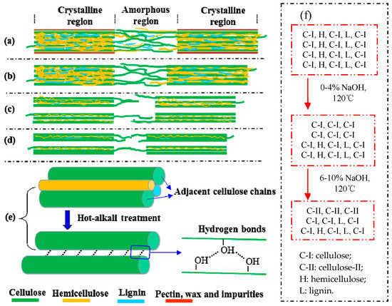 The schematic diagram of fine structure of cellulose and other polysaccharides of hot-alkali-treated jute fibers. (a) untreated, (b) 2% NaOH-treated, (c) 4% NaOH-treated, (d) 6%~10% NaOH-treated, (e) the adjacent cellulose chains, (f) the changes of cellulose, hemicellulose and lignin contents.