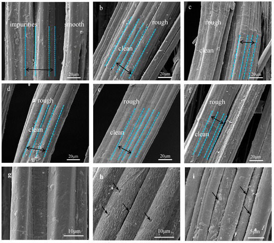 Scanning electron microscope (SEM) images of jute fibers surface: (a), (g) Untreated, (b) 2% NaOH-treated, (c) 4% NaOH-treated, (d), (h) 6% NaOH-treated, (e) 8% NaOH-treated, (f), (i) 10% NaOH-treated.