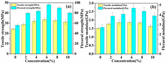 The mechanical properties (tensile and flexural) of laminated composites reinforced with untreated and five concentrations (2%, 4%, 6%, 8% and 10%) of hot-alkali-treated jute fabrics are shown in Table 2 and Figure 8. The standard deviation obtained is included in Table 2 and Figure 8. The result shows that the mechanical properties of the laminated composites increase first, and then decrease, and the fracture strain increases to 1.91 ± 0.18% from 1.55 ± 0.21% with the increasing concentration of the NaOH solution. Especially the mechanical properties of 6% NaOH-treated jute fabrics reinforced laminated composites are superior to others. The tensile strength, flexural strength, tensile modulus and flexural modulus of 6% NaOH-treated fabrics reinforced composites are enhanced by 37.5%, 72.3%, 23.2% and 72.2%, respectively, as compared with those of untreated fabrics reinforced composites. The reason is that hot-alkali treatment increases the contact area between fibers and epoxy resins and enhances the crystallinity of fibers with the impurities, lignin and hemicellulose, having been removed by alkali treatment at 120 °C.