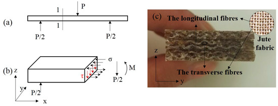 Overall, the hot-alkali treatment improved the mechanical properties of laminated composites, and the bending properties are better than the tensile. This is because of the cross-woven structure of the jute fabric. Under the three-point bending (Figure 9a), the stress distribution at the section 1-1 of the laminated composite is shown in Figure 9b, and the normal stress σ and the shear stress τ are produced by the bending moment M and the shearing force P/2, respectively. The longitudinal fibers (Figure 9c) of jute fabrics can transmit and resist the shear stress τ. Therefore, the strength of the jute fabrics were fully developed.