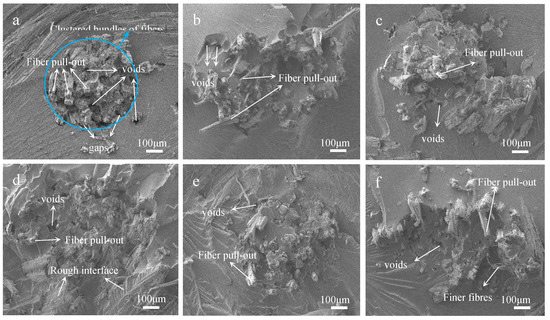 SEM images of fracture surfaces of laminated composites with hot-alkali treated jute fabrics reinforced: (a) 0% NaOH; (b) 2% NaOH; (c) 4% NaOH; (d) 6% NaOH; (e) 8% NaOH; (f) 10% NaOH.