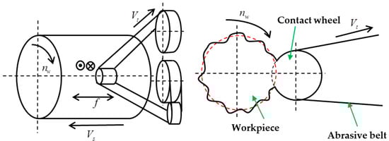 In recent years, there has been a tendency checking new tools and strategies for finishing metal parts, with repeatability and time/money savings being the main purposes. Adrián Rodríguez et al. studied brushing techniques using abrasive flexible tools to improve the surface finish and presented the brushing process to eliminate the spiral roughness pattern on metal brake discs and to optimize the surface of the machined part [5,6]. Abrasive belt polishing is also a flexible processing method for metal finishing. It has been proven by Rech and Moisan [7] that abrasive belt polishing removes the defects of the surface roughness induced by hard turning and leads to a very homogeneous surface. Accordingly, the abrasive belt polishing method has been widely used to enhance the surface quality. However, the deterministic correction of the shape accuracy of shaft parts based on abrasive belt polishing has been rarely studied.