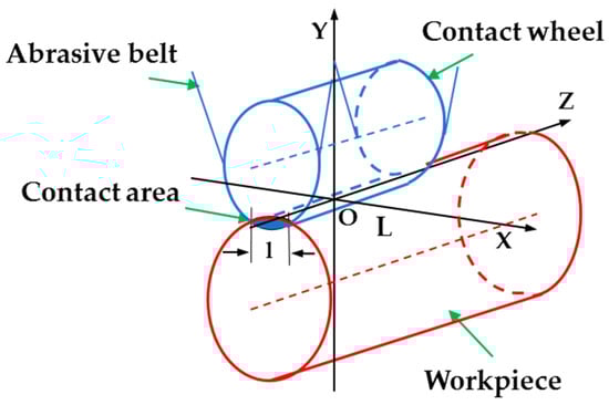 During the belt polishing process, the contact wheel is deformed against the cylindrical workpiece. The parameter L is the length of the contact area between the workpiece and the belt. The width of this area l depends on the applied force F and on the Young’s modulus of the contacting roller which is linked to the hardness of the material [10]. The workpiece used in the experiments is made of 45 steel, the Young’s modulus is 209 Gpa, and the contact wheel is made of rubber, its Young’s modulus is 0.0078 Gpa. In accordance with the Hertzian contact theory [11,12], the pressure in the plane of XOY in the contact area as showed in Figure 2 is distributed as an elliptical curve, and the pressure distribution can be expressed as: