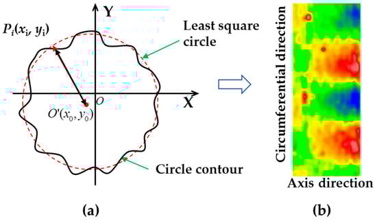 The roundness information about a shaft part should be expressed on an error surface in order to achieve the deterministic figuring for a cylindrical surface. As shown in Figure 3a, assuming that the measured circle contour is on plane XOY, where O denotes the origin of the coordinates, are values in the cartesian coordinate system of the m measured points on plane XOY. The least square center O′(x0, y0) and the least square radius of circle R can be calculated by the following formula [14].
